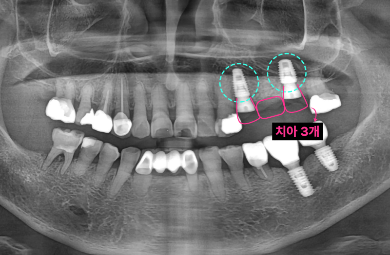 이미 신경치료된 치아 뿌리 끝에 염증이 잡혀있고 브릿지 아래로 2차충치가 크게 생겨서 임플란트로 치료 계획을 정했습니다. 임플란트 2개를 심고 치아 머리(크라운) 3개를 만듭니다. 여러 개의 임플란트를 심을 때 꼭 개수대로 임플란트를 심을 필요는 없습니다. 과거에는 발치, 상악동 수술, 임플란트를 전부 기다리며 나눠서 진행했는데 시간이 너무 오래 걸립니다. 저는 최대한 치아가 없는 기간을 단축시키기 위해서 치아를 뽑고(발치) 동시에 임플란트를 심으며 뼈가 없는 경우 상악동 수술을 동시에 진행합니다.