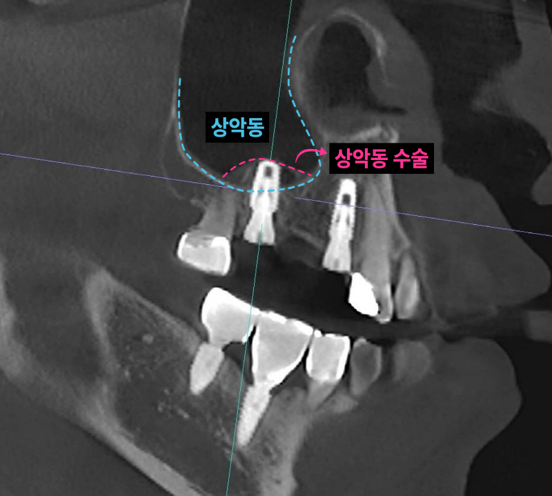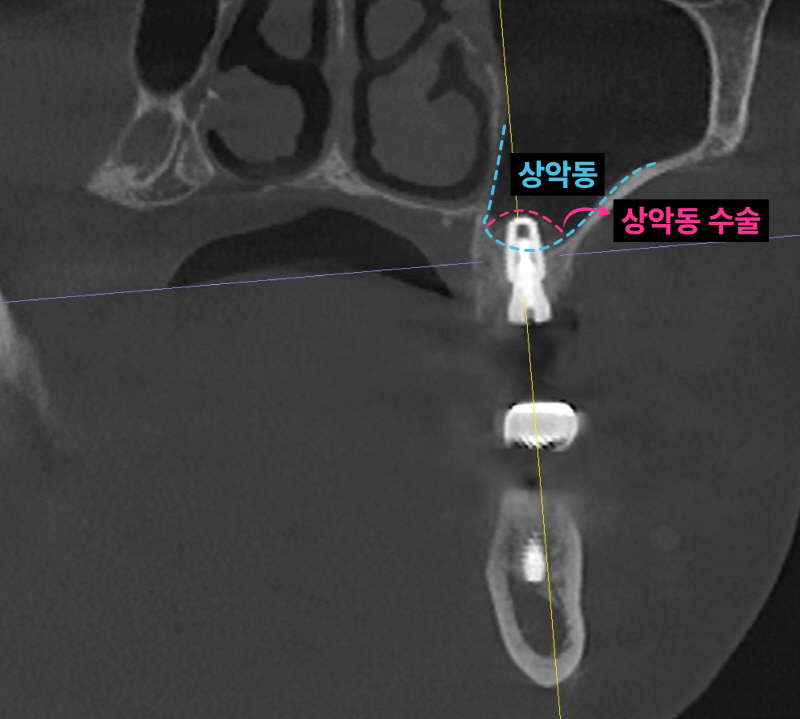 남아있는 잇몸뼈가 5-6mm 정도입니다. 저는 이런한 경우 덴샤버라는 특수한 기구를 이용해서 가능한 빠르면서 안아프고 쉽게 상악동 수술을 시행합니다. 항상 CT를 통해 환자분들께 정확하게 수술된 모습을 보여드립니다.