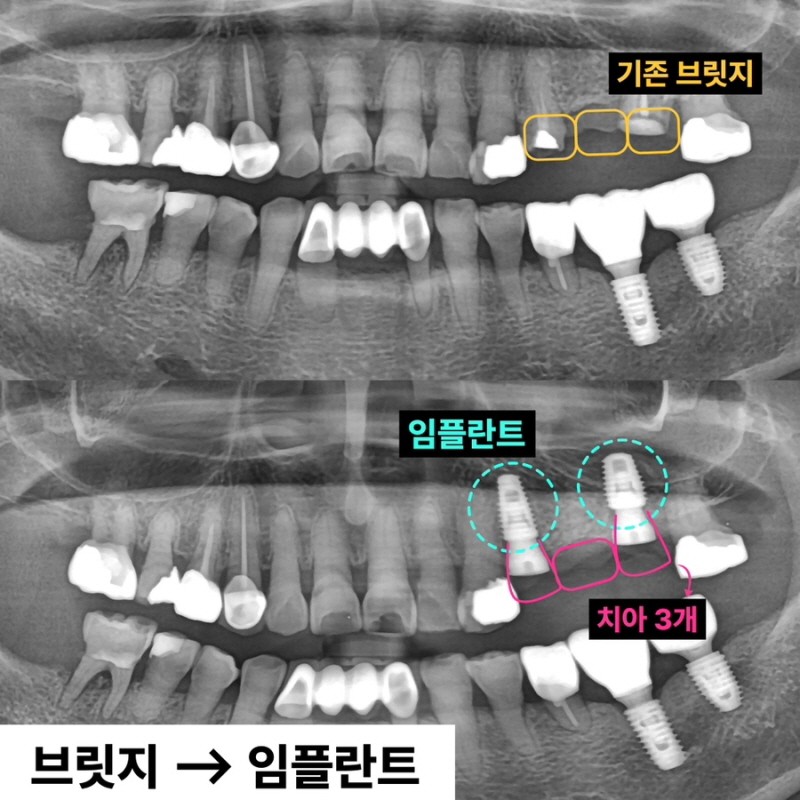 발치, 상악동 거상, 임플란트 식립 모두 이상적인 모습입니다. 과거 임플란트가 없던 시절에는 브릿지 치료가 일반적이었습니다. 하지만 현재는 치아가 없을 때 양 옆의 치아를 갈아서 씌우는 치료는 임플란트 등장으로 없어지고 있습니다. 또한 오래된 브릿지가 흔들리거나 잇몸에 염증이 생긴다면 임플란트로 교체가 필요할 수 있습니다.
