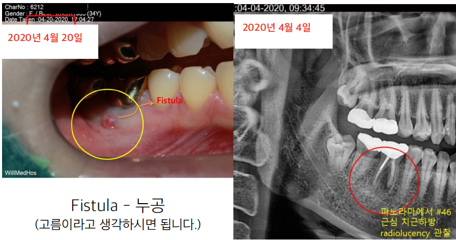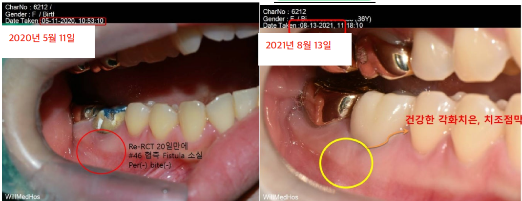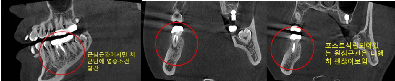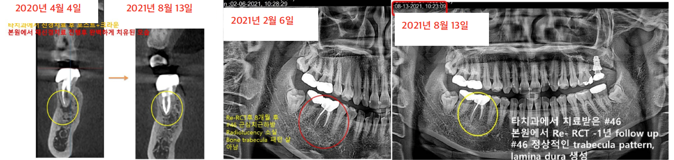 수많은 임플란트 케이스를 진행하면서도 이백점치과는 '자연치아는 그 어떤 임플란트로도 대체할 수 없다'는 확고한 철학을 가지고 있습니다. 그래서 언제나 자연치아를 살리기 위해 최선을 다합니다. 이번 사례는 타 치과에서 발치 진단을 받은 치아를 성공적으로 재신경치료하여 살려낸 고난도 케이스입니다. CASE. "뽑아야 한다던 치아, 재신경치료로 살려냈어요!" ○환자분의 고민 - 타 치과에서 이미 신경치료를 받았음에도 계속 불편감을 호소하며 내원한 환자분이었습니다. - 오른쪽 아래 치아 앞 잇몸에 고름 주머니(농양)가 생겨 있었고,  방사선 사진상 뿌리 끝에 심한 염증과 고름이 확인되었습니다. - 더욱이 이미 신경치료 후 포스트(기둥)까지 박혀있어, 타 치과에서는 이미 '발치'를 고지받은 상황이었습니다. ![]() ○ 진단: 정밀 CT 촬영을 통해 고름 주머니가 생긴 원인을 분석했습니다. 기존 신경치료가 되어있던 뒤쪽 뿌리가 아닌,  앞쪽 뿌리의 신경관에 문제가 발생하여 염증이 재발된 것을 정확히 진단했습니다. ![]() '발치 없이' 자연치아를 살리는 재신경치료 이백점치과는 고심 끝에 기존 기둥을 그대로 두고, 문제의 원인이었던 앞쪽 뿌리를 다시 신경치료하기로 결정했습니다. 1. 정교한 기존 재료 제거 : 기존에 충전되어 있던 신경치료 재료를 조심스럽게 제거했습니다. 2. 꼼꼼한 신경관 재정비 : 뿌리 끝까지 신경관을 깨끗하게 넓히고 소독했습니다. 3. 염증 해소 약재 적용 : 뿌리 끝 염증 해소를 위해 염증 완화 약재를 세심하게 적용했습니다. 기적 같은 결과, 1년 후에도 건강하게! - 3주 만의 드라마틱한 호전: 불과 3주 만에 바깥 잇몸의 고름 주머니가 완전히 없어졌고, 환자분의 모든 증상이 사라졌습니다.  이후 신경치료를 마무리하고 보철 치료까지 성공적으로 진행했습니다. - 1년 뒤에도 완벽한 경과: 1년 뒤 다시 체크했을 때, 염증은 전부 가라앉았고 고름 주머니 흔적 없이 깨끗했습니다.  심지어 염증으로 녹아있던 뼈 부위에는 새로운 뼈가 형성되고 있음이 확인되었습니다. ![]() 환자분 또한 통증 없이 건강하게 생활할 수 있어 매우 감사하다는 인사를 전했습니다. ![]() 이처럼 살리기 어렵다고 판단되던 고난도 치아를 발치 없이 살려낸 사례는 의료계 내부에서도 높은 평가를 받았습 니다. 이백점치과는 항상 환자분의 입장에서 생각하며 '발치만이 해답이 아님'을 증명하고, 자연치아 보존을 위한 최선의 노력을 다하고 있습니다. ![]()  |