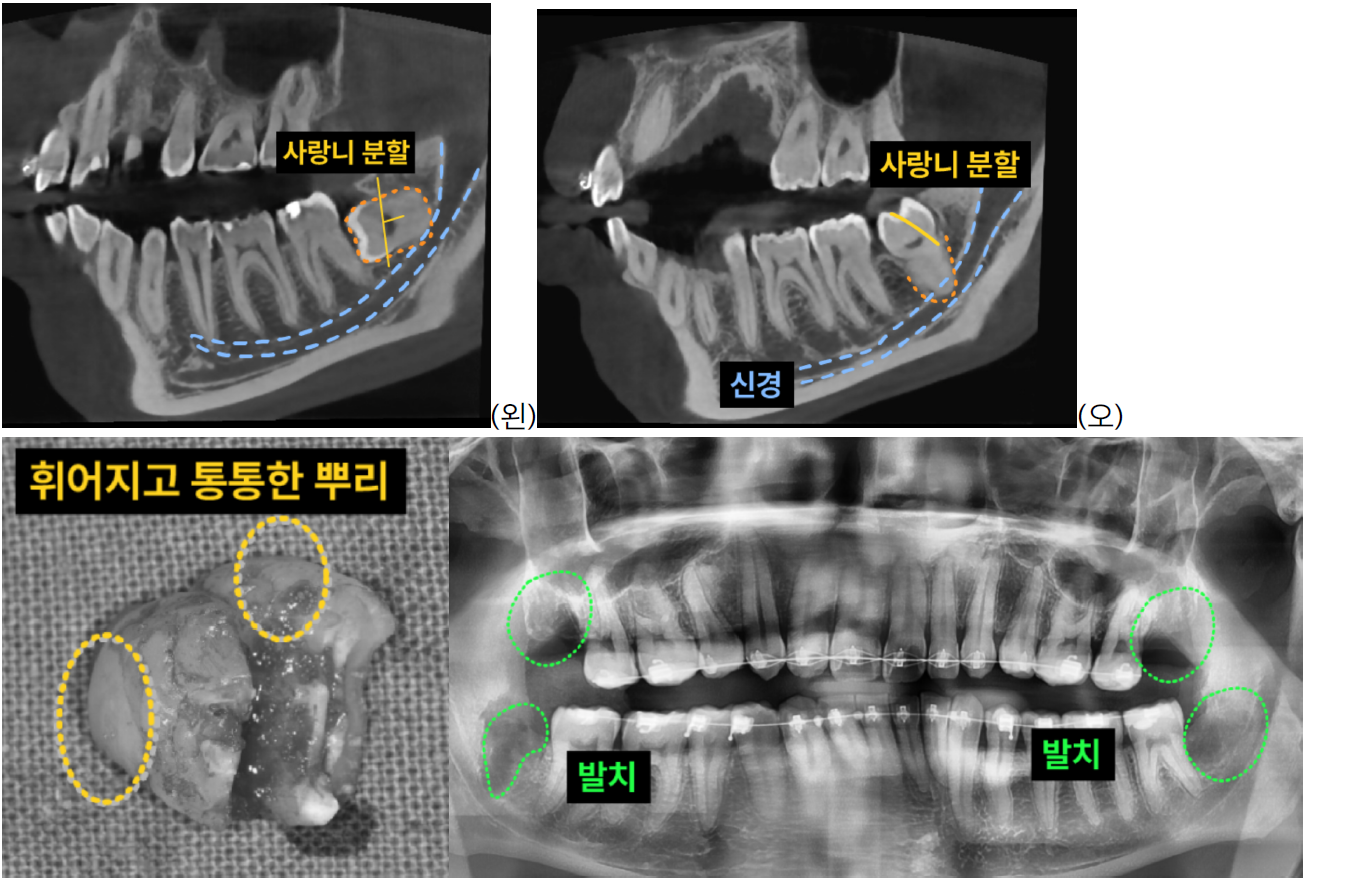 | "동네 치과에서는 어렵다던 사랑니", "대학병원으로 가야 한다던 사랑니" 혹시 이런 이야기를 들어본 적 있으신가요? 사랑니 발치는 그 위치와 형태, 주변 신경과의 관계에 따라  고난이도 시술이 될 수 있습니다.  이백점치과는 어떤 형태의 사랑니든 정확하게 진단하고 안전하게 발치하여, 환자분들이 더 이상 고민하지 않도록 도와드립니다. CASE. 20대 남성 환자. 교정 치료를 위한 고난도 사랑니 발치 ○ 내원 동기: 교정 치료를 위해 상하좌우 4개의 사랑니 발치를 의뢰받아 내원하셨습니다. ○ 진단: - 3D CT 촬영을 통해 사랑니의 정확한 위치와 매복 정도, 그리고 주변 신경관과의 관계를 면밀히 분석했습니다. - 왼쪽 아래 사랑니는 가로로 깊이 매복되어 신경과 매우 가까웠으며, - 오른쪽 아래 사랑니는 신경과 근접한 것은 물론 뿌리가 크고 통통하며 'ㄱ'자 형태로 휘어진 고난이도 형태였습 니다. ![]() 이백점치과의 정교한 사랑니 발치 과정 사랑니는 경우에 따라 하루에 모두 발치할 수도 있지만, 일반적으로 좌우를 나누어 진행합니다. 1. 세심한 발치 계획 수립: 3D CT 분석을 바탕으로 각 사랑니의 형태와 주변 구조물을 고려한 맞춤형 발치 계획을 수립합니다. 2. 정밀 분할 발치: 특히 깊이 매복되어 신경과 가까운 사랑니는 신경 손상 위험을 최소화하기 위해  사랑니의 머리(치관)와 뿌리(치근)를 적절히 분할하여 조심스럽게 발치합니다. 이 과정은 숙련된 의료진의 정교한 기술이 필수적입니다. 3. 성공적인 발치 완료: 좌우 상하 4개의 모든 매복 사랑니를 성공적으로 발치하여, 환자분은 불편함 없이 교정 치료를 위한 충분한 공간을 확보할 수 있었습니다. ![]() 안전하고 편안한 사랑니 발치, 이백점치과가 약속합니다 사랑니는 깊이 누워있거나 숨겨져 있다고 해서 무조건 발치해야 하는 것은 아니지만,  정과 같은 명확한 목적이 있을 경우에는 꼭 필요합니다. 이백점치과는 안전하고 편안한 발치를 최우선으로 합니다. - 통증 최소화: 숙련된 마취와 섬세한 시술로 통증을 최소화합니다. - 불안감 해소: 치과 치료에 대한 두려움이 있는 환자분들을 위해 수면치료(수면 마취)를 동반한 발치도 가능하여, 편안하게 시술받으실 수 있습니다. 이제 사랑니 때문에 더 이상 고민하지 마세요! 이백점치과에서 정밀 진단과 숙련된 노하우로 여러분의 사랑니를 안전하고 편안하게 해결해 드리겠습니다.  |