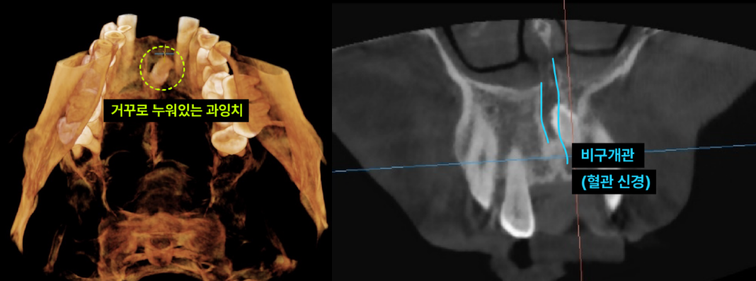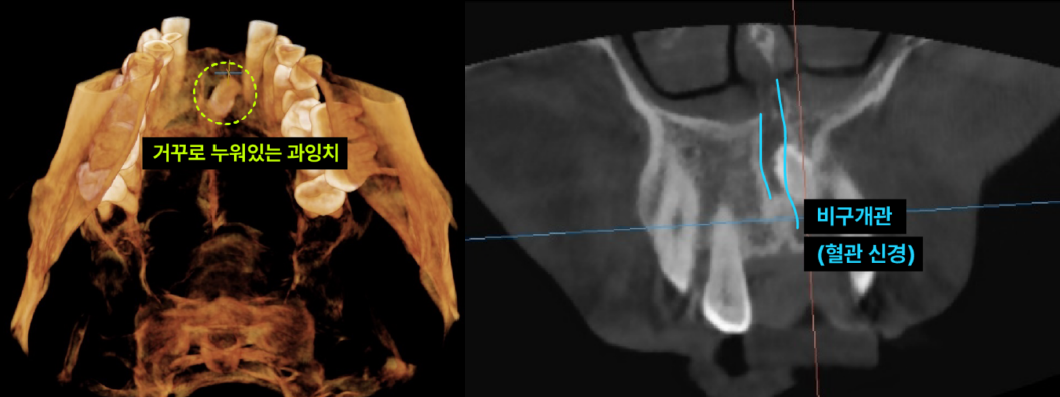 이백점치과의 정밀 진단 환자의 과잉치는 입천장 뼈 속에 거꾸로 누워있었고, 중요한 신경과 혈관이 지나는 '비구개관(Incisive Canal)'을 침범한 상태였습니다. 이처럼 민감한 부위의 매복 과잉치를 제거할 때는 비구개신경 손상이나 출혈에 각별히 주의해야 합니다. 이백점치과는 최신 장비를 활용한 정밀 진단으로 이런 디테일까지 놓치지 않습니다.